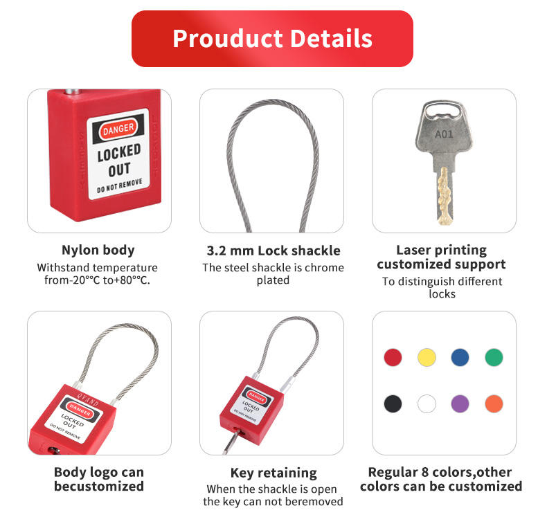 This industrial cable padlock features a flexible stainless steel cable that easily fits through tight spaces and multiple locking points. It is designed specifically for lockout-tagout procedures to ensure machinery remains safely turned off during maintenance. The keyed-alike system allows you to open multiple locks with a single key, making it simple to manage security across a large workspace.