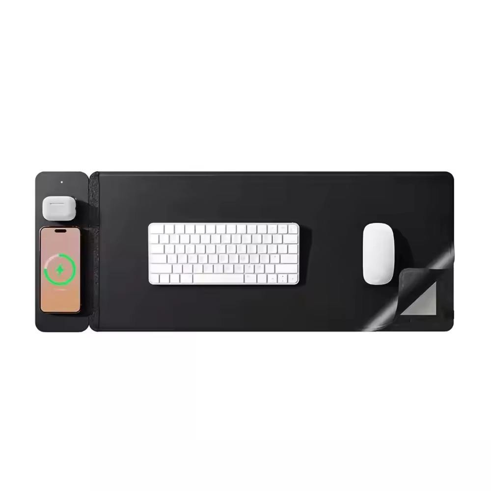 This durable desk mat features a built-in wireless charging pad to power your smartphone while you work. The waterproof and scratch-resistant surface protects your desk from spills and daily wear, providing a smooth area for your mouse and keyboard. It is a practical solution for keeping your workspace tidy and your devices charged without extra cables.
