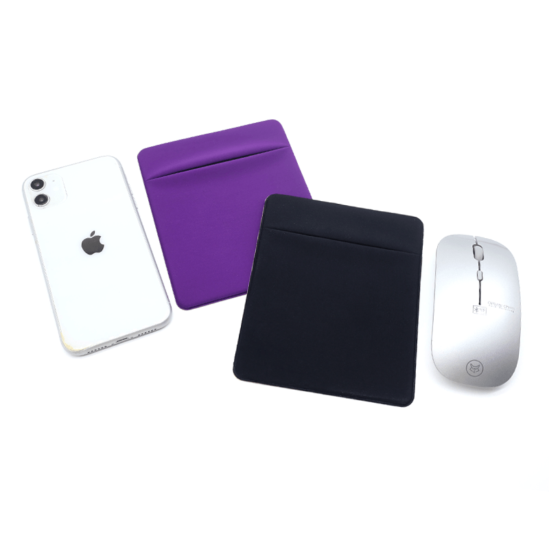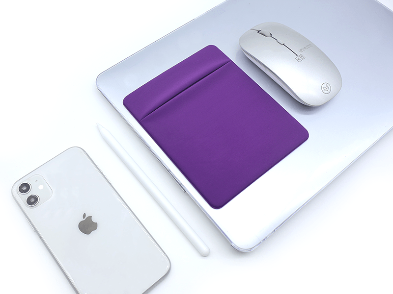 This slim storage pouch sticks directly to the back of your laptop to keep your mouse and pens organized. It is made from stretchy Lycra material that holds your accessories securely while staying flat and lightweight. This is a practical solution for carrying essential tech gear without needing an extra bag.
