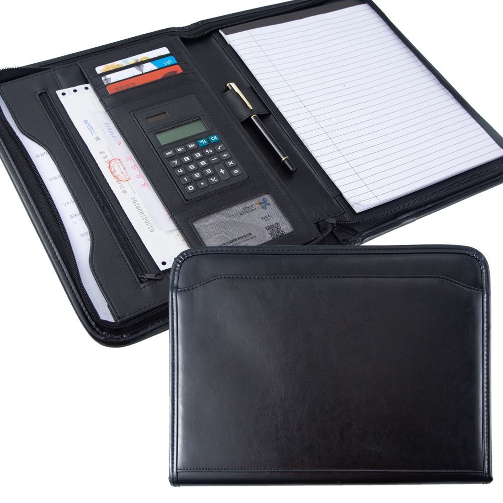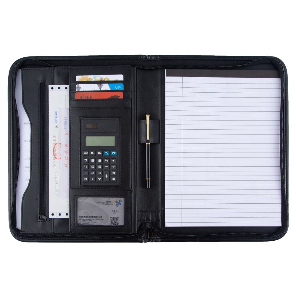 This leather A4 padfolio features a secure zipper closure and multiple interior pockets to keep your documents, business cards, and pens organized. It includes a built-in calculator and a dedicated slot for a notepad, making it a complete workstation for meetings or travel. The professional brown leather finish is durable and keeps your important files protected and easy to carry.