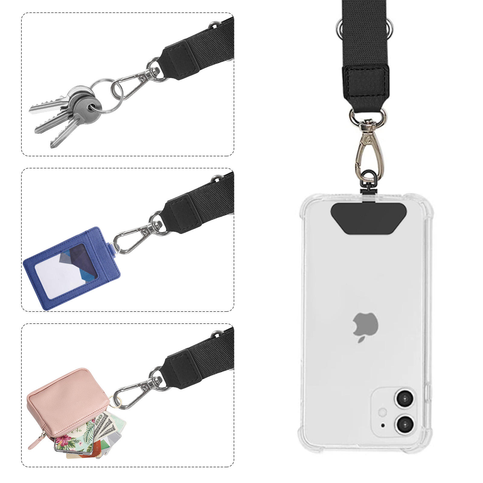 This retractable crossbody phone lanyard features a strong stainless steel connector that rotates freely to prevent tangling. The adjustable metal chain allows you to wear your phone comfortably around your neck or across your body for hands-free use. It includes a durable patch that fits inside most phone cases, keeping your device secure and easy to reach.
