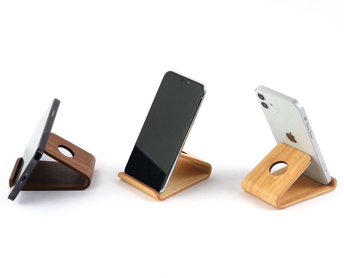 This solid walnut wood stand provides a sturdy and stable base for your smartphone on any flat surface. It holds your phone at a comfortable viewing angle, making it perfect for watching videos or making video calls hands-free. The compact size saves space on your desk while keeping your device organized and easy to reach.