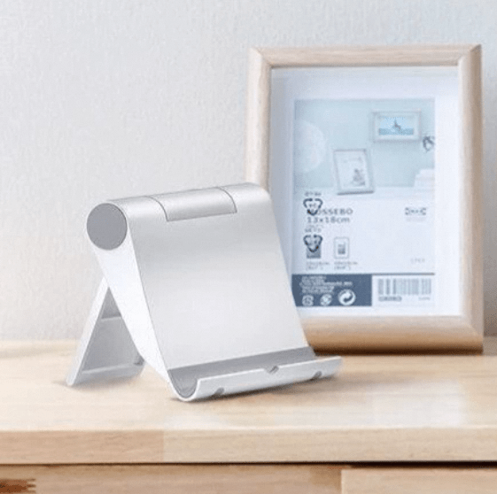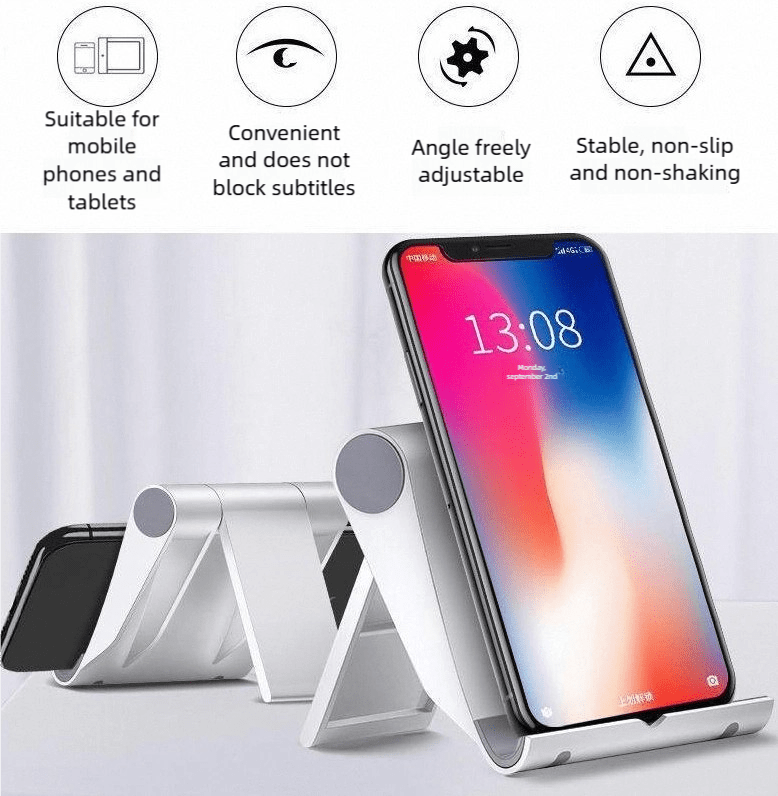 This portable desk stand provides a stable and adjustable base for your smartphone or tablet. Made from flexible plastic, it allows you to change the viewing angle for better comfort while working or watching videos. Its compact design fits easily on any office desk or nightstand, helping you keep your device visible and hands-free.