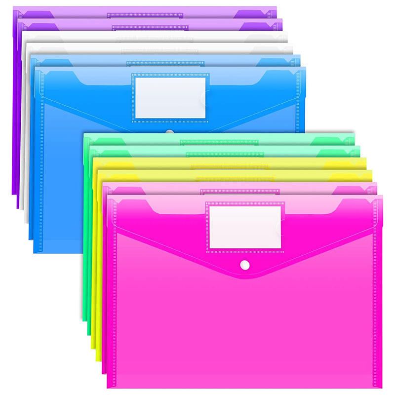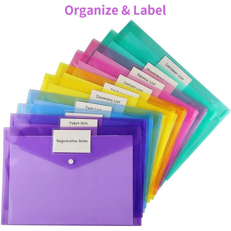 This A4 file bag is made of durable, transparent plastic that lets you quickly identify your documents without opening it. It features a secure snap button closure to keep your papers safe and an integrated label slot for easy organization. The waterproof material protects your important files from spills and moisture, making it perfect for office or school use.